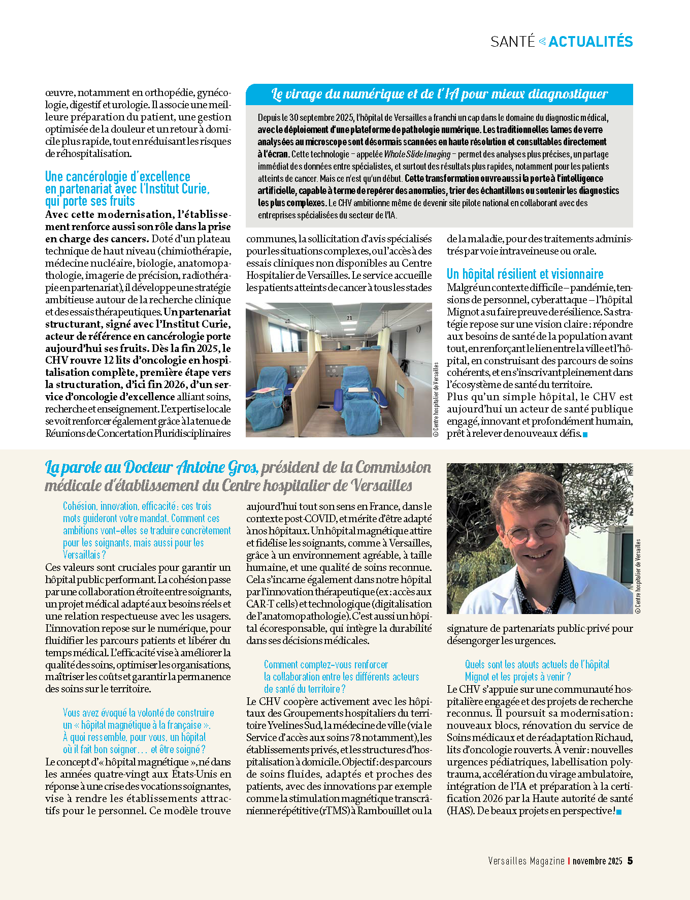 Le Centre Hospitalier de Versailles (CHV) est mis en lumière dans le dernier numéro du magazine officiel de la Ville de Versailles à travers une double page dédiée.