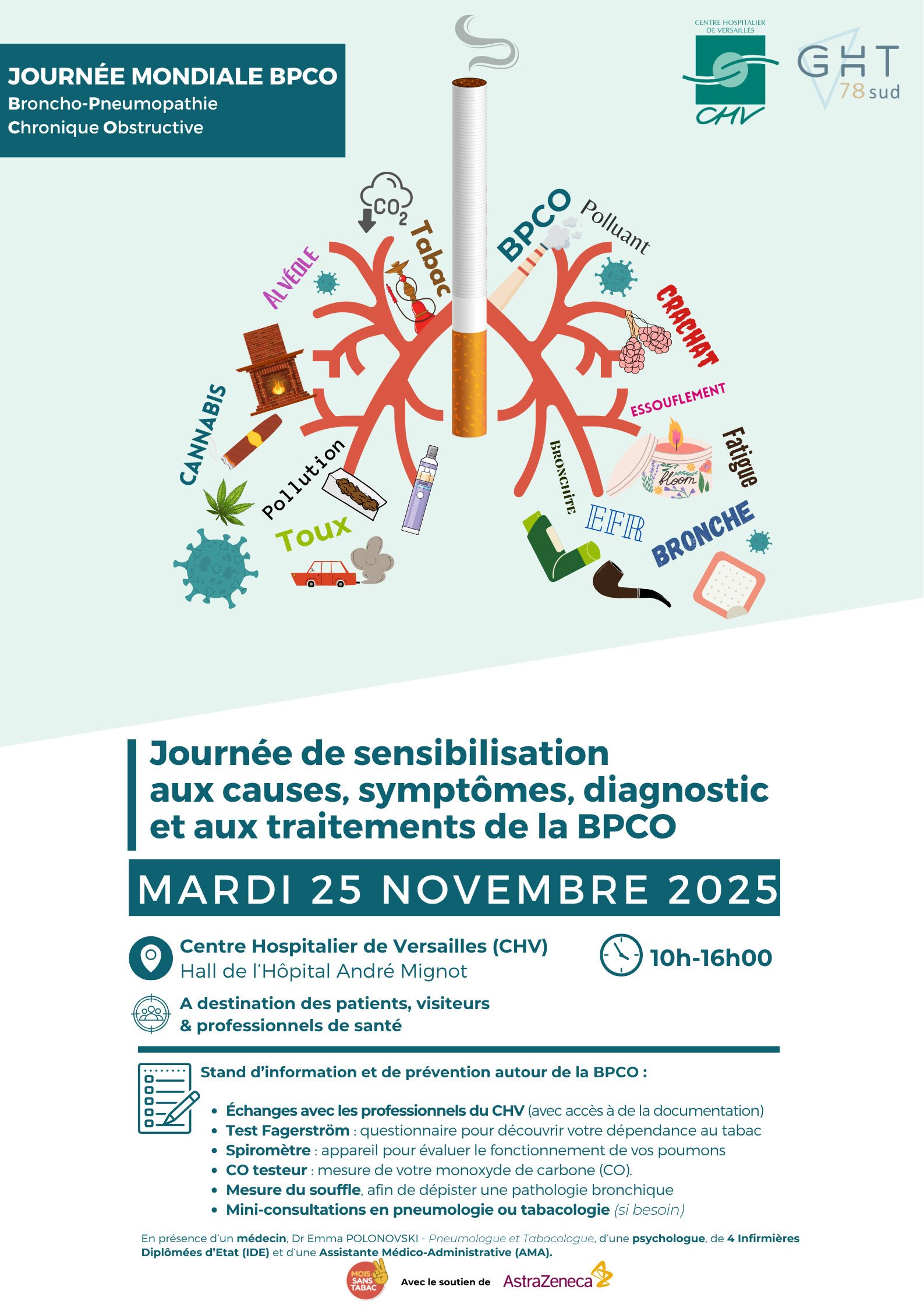À l’occasion de la Journée mondiale de la Broncho-Pneumopathie Chronique Obstructive (BPCO), le Centre Hospitalier de Versailles organise une journée de sensibilisation aux causes, symptômes, diagnostic et traitements de cette maladie respiratoire.
